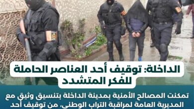 تمكنت المصالح الأمنية بمدينة الداخلة بتنسيق وثيق مع المديرية العامة لمراقبة التراب الوطني، من توقيف أحد العناصر الحاملة للفكر المتشدد…