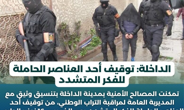 تمكنت المصالح الأمنية بمدينة الداخلة بتنسيق وثيق مع المديرية العامة لمراقبة التراب الوطني، من توقيف أحد العناصر الحاملة للفكر المتشدد زوال يوم الخميس 16 نونبر الجاري، وذلك في سياق العمليات الأمنية المتواصلة لمواجهة وتحييد مخاطر التنظيمات الإرهابية التي تحدق بأمن المملكة وسلامة المواطنين.