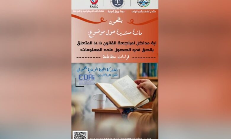 ويأتي تنظيم هذا اللقاء في سياق النقاش الوطني المتجدد حول تقييم الإطار القانوني والتنظيمي للحق في المعلومة، باعتباره ركيزة أساسية لترسيخ مبادئ الشفافية وربط المسؤولية بالمحاسبة وتعزيز الثقة بين المواطن والمؤسسات.